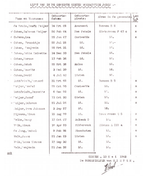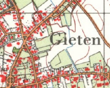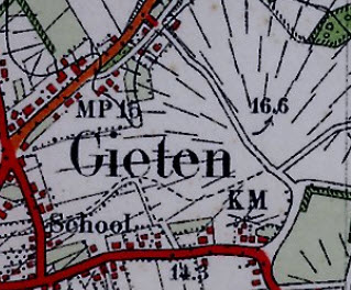 kaart 1954 Dat pad schijnt niet helemaal doorgelopen te hebben naar de Oude Wildervanksterweg, maar het zou halverwege stoppen hij bij de plek waar het afvalwater van de melkfabriek bij het afvalwater van Udema bij elkaar kwamen. (Overigens ben ik ook wel geïnteresseerd in de precies loop van het afvalwater van Udema!). En de aanduiding "Jodenpad" zou inderdaad te maken hebben met de bewoning van het huis Bonnen 7 door Mennie Meyer en daarvoor door zijn schoonouders de familie Gottfriedt. In 1942 gaf de gemeente trouw de woonplaatsen van de in Gieten woonachtige Joden door: