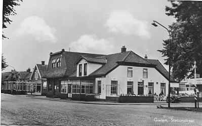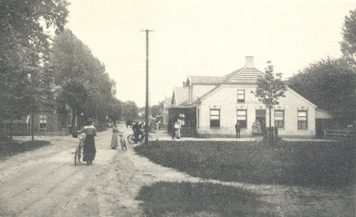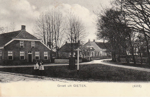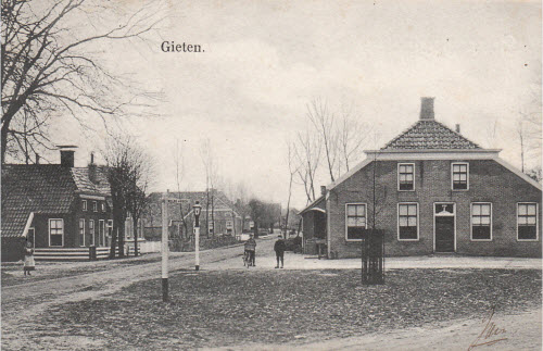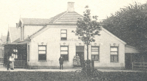 Het concertgebouw van Gieten: Zaal Tent De foto´s op deze pagina zijn van boven naar beneden in volg- orde van tijd. Deze hier direct onder moet van rond 1900 zijn, want deze kaart is in 1906 verstuurd. Het geheel ziet er nog vooral uit als een boerderij. Helaas is niet te lezen wat er op het uithangbord op de hoek en het fietsenrek geschreven staat. |
