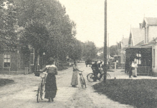 We proberen even een beter zicht te krijgen op dit straattafereel. In totaal kunnen we zes fietsen op deze foto ontwaren. Maar er is niemand die fietst. Vier mensen staan/lopen met hun fiets. Twee fietsen zijn achteloos tegen een boompje gestald. Zullen die fietsen ook voorzien zijn van een kettingslot?? ![]()