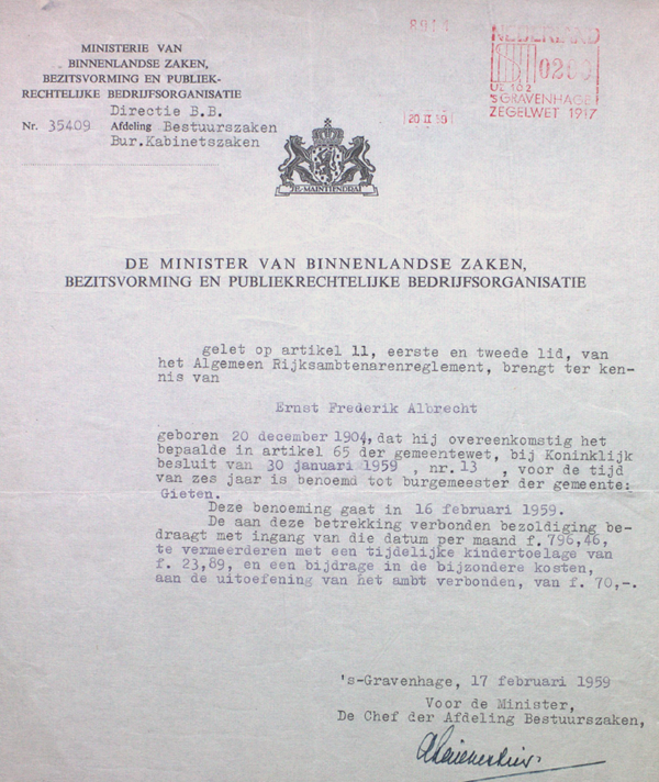 Op 16 februari werd de heer Albrecht in een stampvolle zaal Tent geïnstalleerd, nadat hij met zijn vrouw door toekomstige collega's en muziek bij de gemeentegrens werd afgehaald. Als te doen gebruikelijk werden voor de feestelijke inhaal ook kinderen ingezet. Die dag viel die eer te beurt aan Jante Udema en Tineke Postma. De Asser Courant was de volgende dag zorgvuldig in de berichtgeving en deelde ons mee dat de beide meisjes Mevrouw Nijenhuis een fraai boeket aanbood bestaande uit roze anjers, prunus en witte seringen.