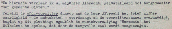 Vervolgens waren er de woorden en bedankjes van de verse burgemeester. In zijn beschrijving besteedt Albrecht hier ruim aandacht aan. Hij had zijn voorganger Nijenhuis nog niet ontmoet, maar was in de zaal aanwezig.