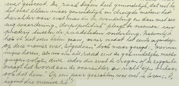 In zijn verslag beschrijft Albrecht op komische wijze de amateuristische wijze waarop de gemeenteraad vergaderde. Al in de eerste raadsvergadering ging hij 'orde op zaken stellen'.