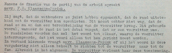 Dat een en ander wel indruk heeft gemaakt, bleek toen bij de afscheidvergadering van 14 juni 1962 mevrouw Klaassens Perdok het woord ging voeren. Uit de notulen van die vergadering: