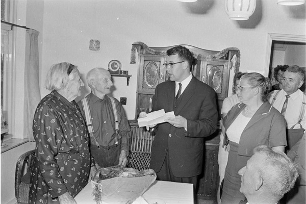 Pieter Venema had ook nog een mooie foto van deze feestelijke bijeenkomst. Burgemeester Huib van Walsum en wethouder Frouwien Klaassens-Perdok kwamen persoonlijk naar de Varik om het echtpaar te feliciteren en om de brief + taart van Koningin Juliana te overhandigen.
