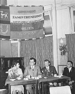 Veenhof is naast fanatiek zingend lid ook gedurende 28 jaar bestuurslid geweest. Als secretaris zien we hem op de receptie ter gelegenheid van het 60 jarig bestaan in 1972. Links van hem zitten de bestuursleden Froukje Westerhuis en Harrie Huiting. Helemaal rechts toenmalig dirigent Couvert. |