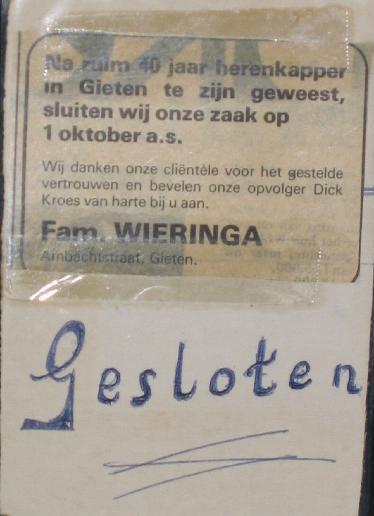 Maar aan alle flitsende carrières komt eens een einde. Ook de familie Wieringa moest afscheid nemen. Op de deur werd deze laatste groet geplakt.