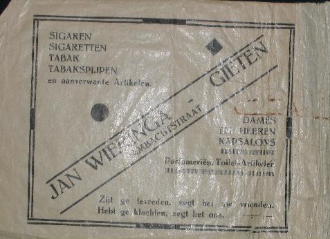 Het was vroeger niet ongebruikelijk dat je in de winkel een sigaar per stuk of twee stuks kocht. Deze werden dan verpakt in een zogeheten sigarenzakje. Hieronder zien we zo'n zakje afgebeeld. Dit zakje leert ons tevens dat we ook voor parfumeriën en Toilet-Artikelen bij Jan aan het goede adres waren.