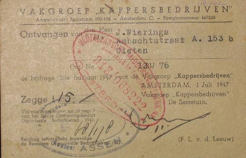 Jan Wieringa was kapper. Onderstaande kwitantie uit 1947 voor de lidmaatschapsbijdrage aan de vakgroep "kappersbedrijven" laat daarover geen misverstand verstaan.