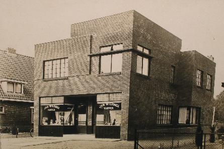 Onderstaande foto toont ons het karakteristieke gebouw waarin de zaak gevestigd was. Het is me indertijd niet zo opgevallen, maar het is eigenlijk toch een architectonisch wondertje..