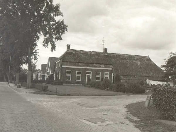 Bovenstaand beeld is uit het begin van de jaren vijftig. Eigenlijk is er aan de aanblik nog niet zo heel veel veranderd. Onder meer zien we het huis waar Anne Oosterhof heeft gewoond. Later werd het ons politiebureau: Weggemans ging er toen wonen. Anne heeft nog goede herinneringen aan de periode dat het voetbalveld er niet was. Daar stonden toen in de zomer, net als bovenop de Hondsrug, de 'zaodbulten'.