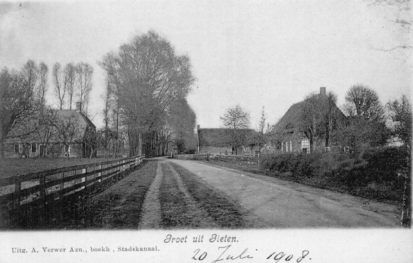 van, maar het zou natuurlijk best kunnen. Wat denken jullie? Nu we toch bij de afslag van het Westerend zijn, wil ik u eindelijk een foto van deze straat laten zien. Er is al veel naar gevraagd, maar ik had er geen. Nu dan eindelijk een ansichtkaart van het "Westereinde". De straat die in het verleden ooit één van de mooiste straten van Gieten is geweest.