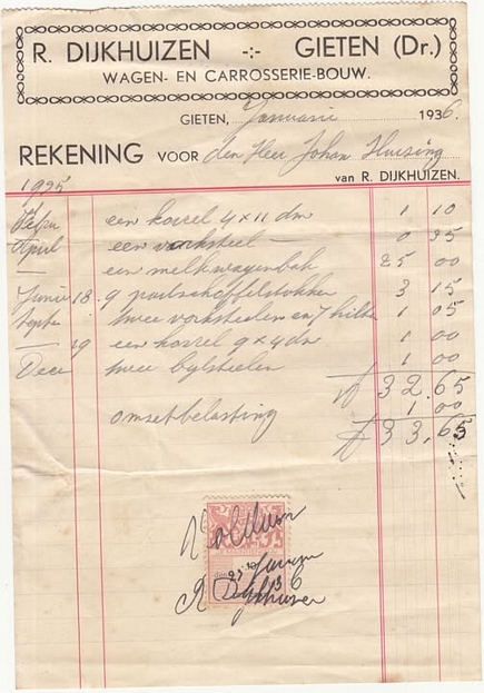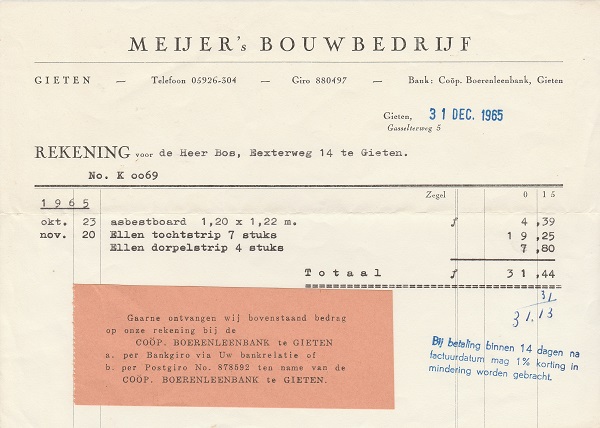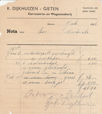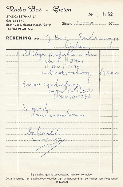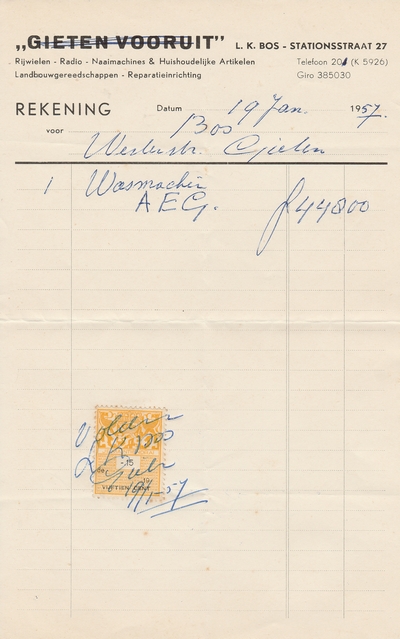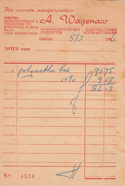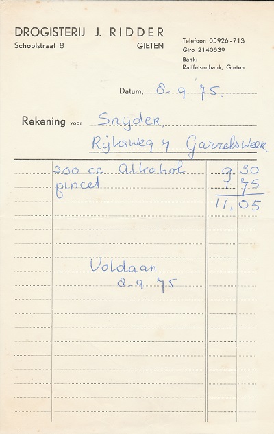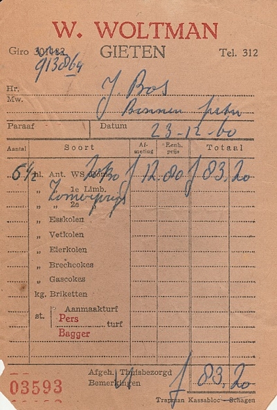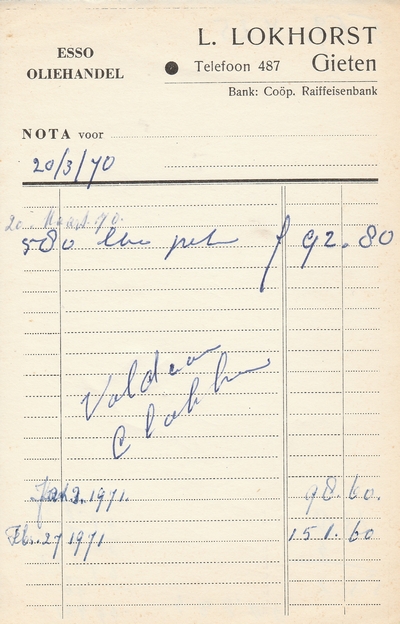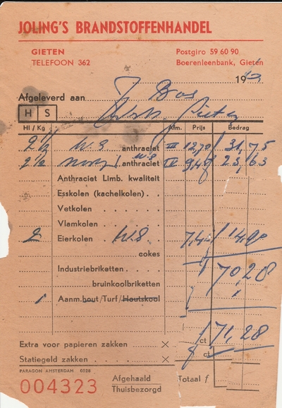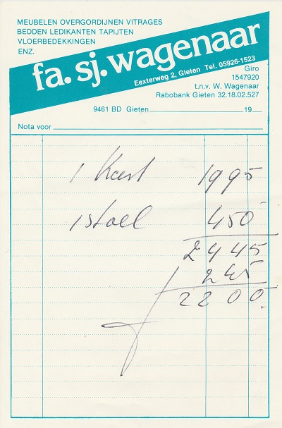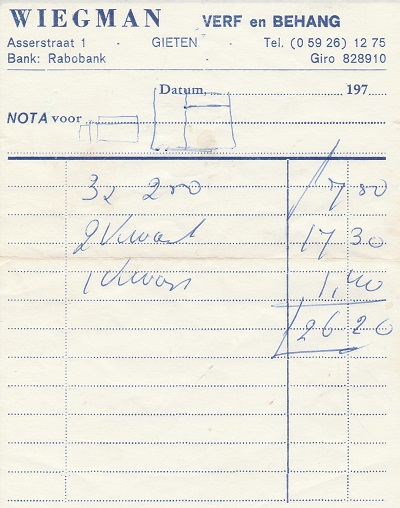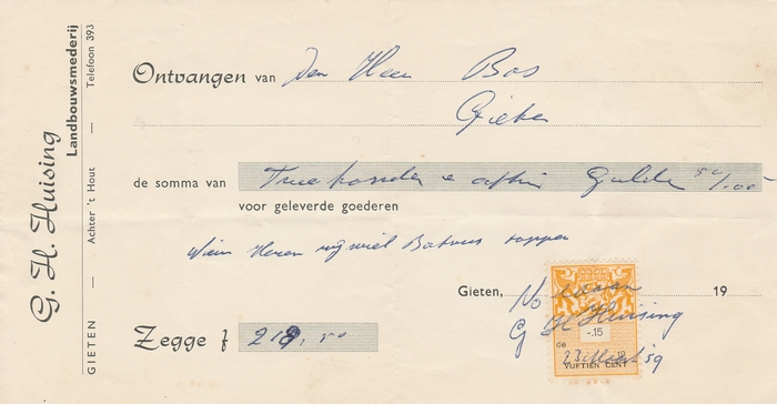 (2022-02) In de loop van 2021 hebben we op Facebook een wekelijkse rubriek gehad waarin we bonnetjes publiceerden van winkels en dienstverleners uit het dorp Gieten. Dit was naar aanleiding van de opruimactie die Hans Bos uit De Bilt thuis hield. Daarbij kwamen ze naar boven. Op deze pagina gaan we ze, samen met bonnetjes die we al eerder hadden ontvangen, allemaal bij elkaar plaatsen. We kunnen dat in de toekomst natuurlijk ook steeds aanvullen. We gaan niet elk gevonden bonnetje laten zien, maar als de betreffende neringdoende de huisstijl weer eens heeft aangepast, dan kunnen we die ook in de tijd volgen. We zetten ze om te beginnen toch al in chronologische volgorde, zodat we ook nog een idee krijgen van de ontwikkeling van prijzen in de loop der tijd. Hoewel een