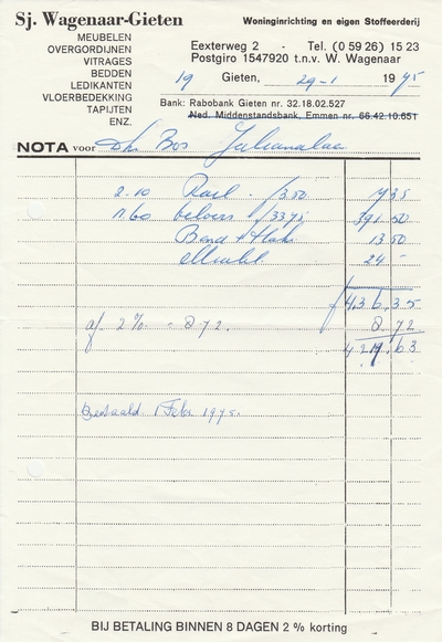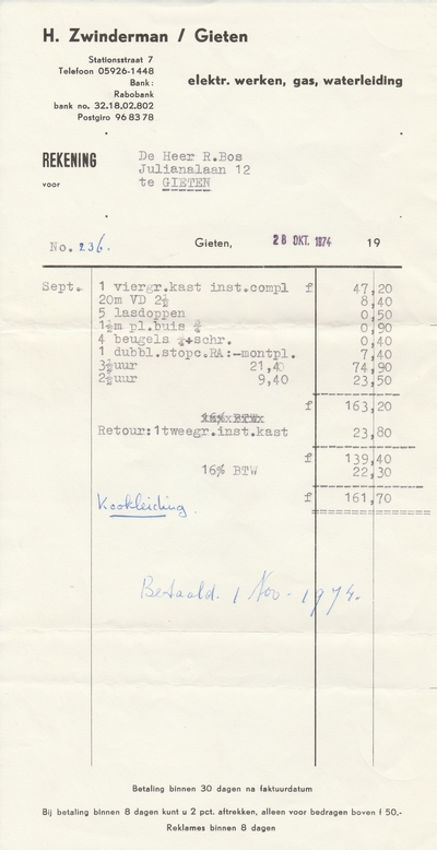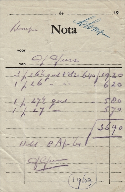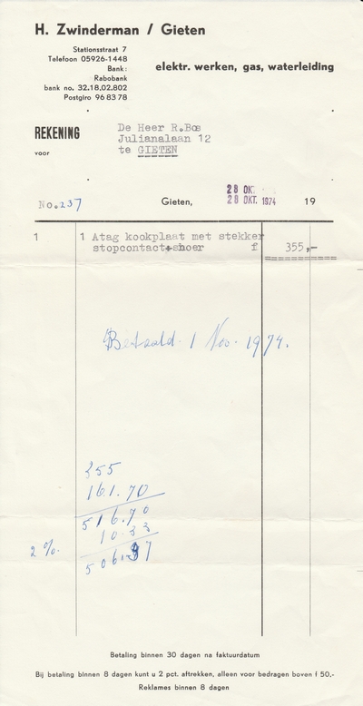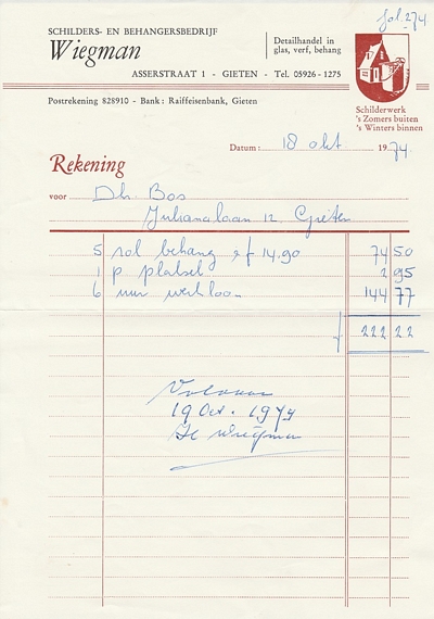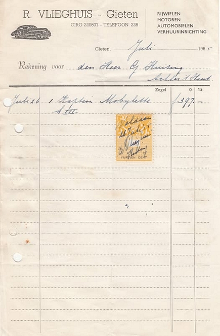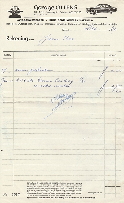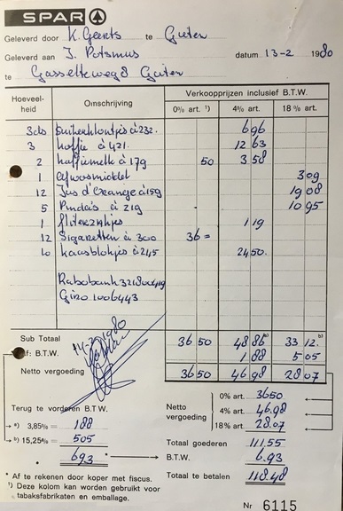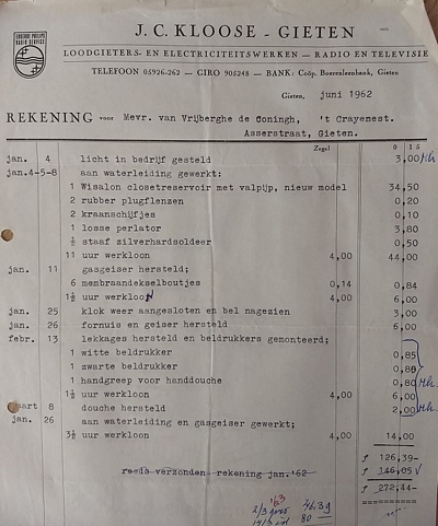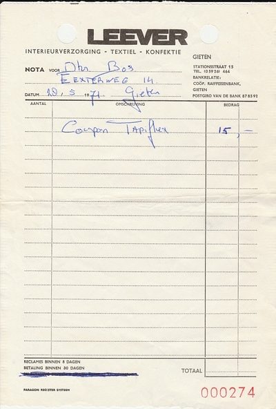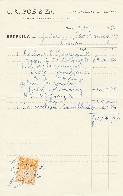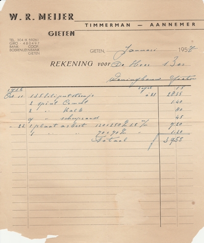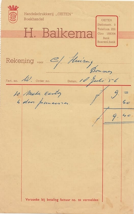 (2022-02) In de loop van 2021 hebben we op Facebook een wekelijkse rubriek gehad waarin we bonnetjes publiceerden van winkels en dienstverleners uit het dorp Gieten. Dit was naar aanleiding van de opruimactie die Hans Bos uit De Bilt thuis hield. Daarbij kwamen ze naar boven. Op deze pagina gaan we ze, samen met bonnetjes die we al eerder hadden ontvangen, allemaal bij elkaar plaatsen. We kunnen dat in de toekomst natuurlijk ook steeds aanvullen. We gaan niet elk gevonden bonnetje laten zien, maar als de betreffende neringdoende de huisstijl weer eens heeft aangepast, dan kunnen we die ook in de tijd volgen. We zetten ze om te beginnen toch al in chronologische volgorde, zodat we ook nog een idee krijgen van de ontwikkeling van prijzen in de loop der tijd. Hoewel een