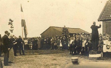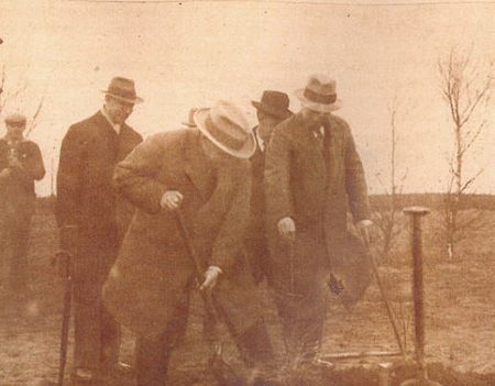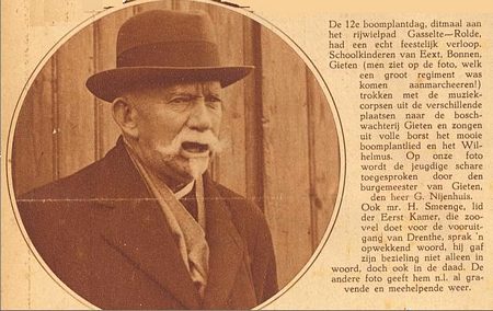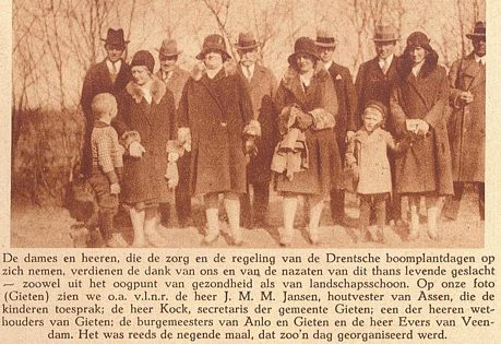 De man rechts met de bolhoed was onze toenmalige burgemeester Arriëns. Hij werd in 1916 op 39-jarige leeftijd burgemeester van Gieten. Hij bleef dat tot 1930. Op deze dag van de boomplantdag was hij dus 48 jaar.