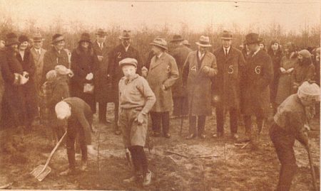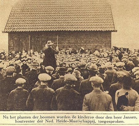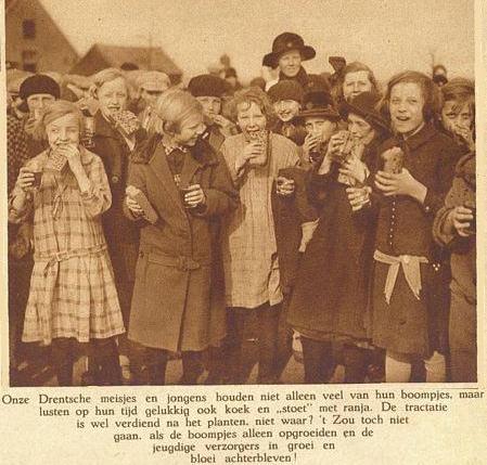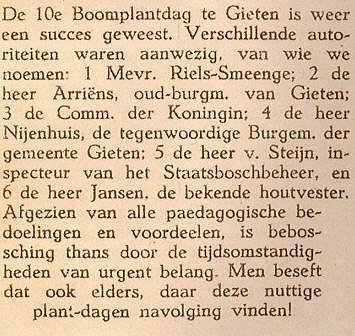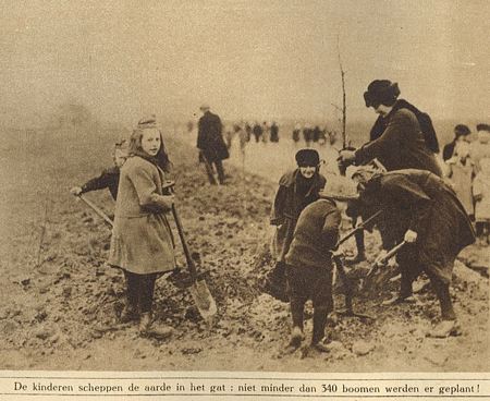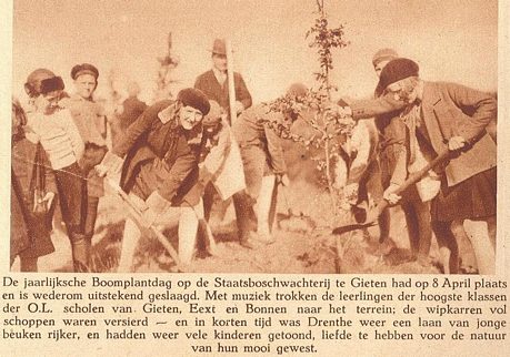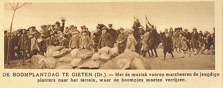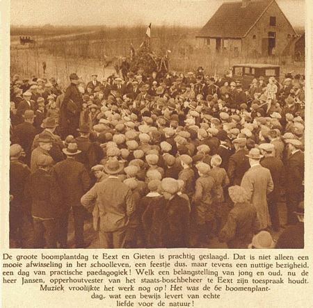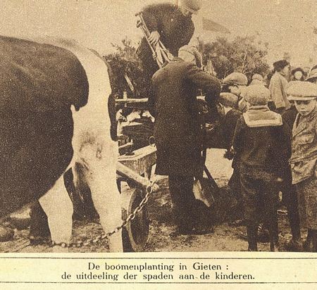 Maar Van Dissel had niet helemaal naar Amerika hoeven gaan. Want hij had ook bij ons kunnen blijven. We hebben de kranten er een op na gekeken en wij komen tot de conclusie dat we in ons dorp al in 1922 onze eerste boomfeestdag hadden. We hebben er een mooie fotoserie van gemaakt. Kijk eens hoe kaal het Staatsbos er in die dagen nog bij lag... We noemden het toen nog het Gieterveld.