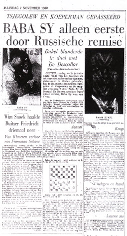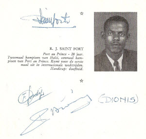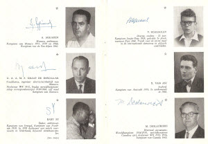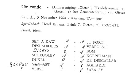 (2008-12)Bé Speelman heeft nog een programmaboekje van toen, met daarin de handtekeningen van de deelnemers. Hij heeft beloofd ze eens voor ons te gaan scannen. We kijken er naar uit! Vooral ook naar de handtekening van Baba Sy. Hij kon wel goed dammen, maar schrijven kon hij niet...