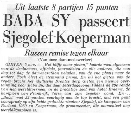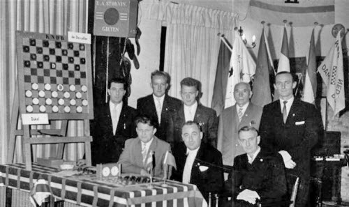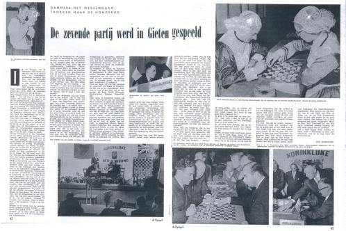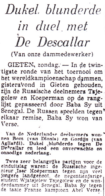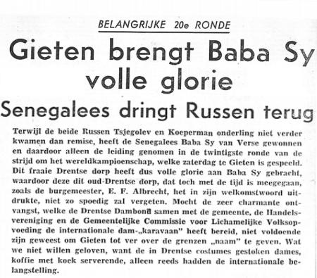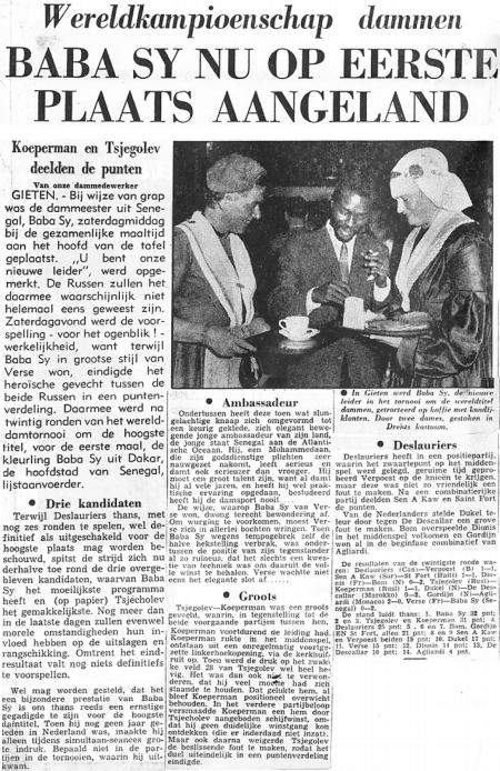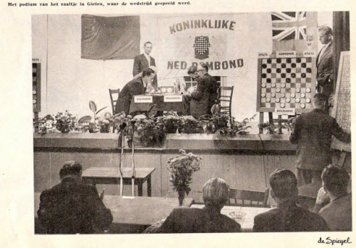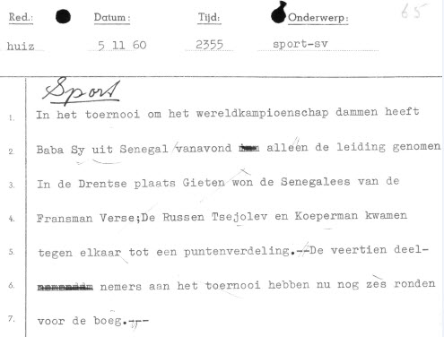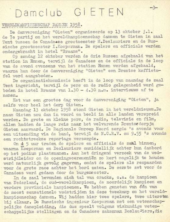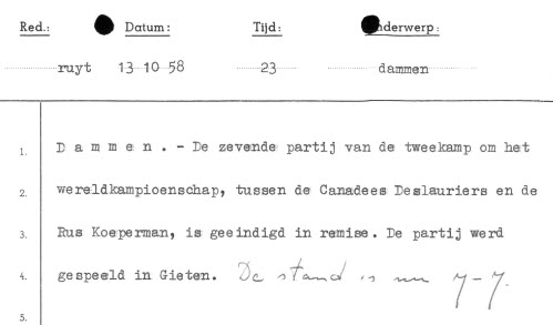 Tot zover het kampioenschap van 1960. Maar wie denkt dat er toen in Gieten voor het eerst op wereldniveau werd gedamd heeft het mis. Want in mijn zoektocht naar berichten over het damkampioenschap stuitte ik bij de berichten van de radionieuwsdienst van het ANP op het volgende bericht van 13 oktober 1958.
