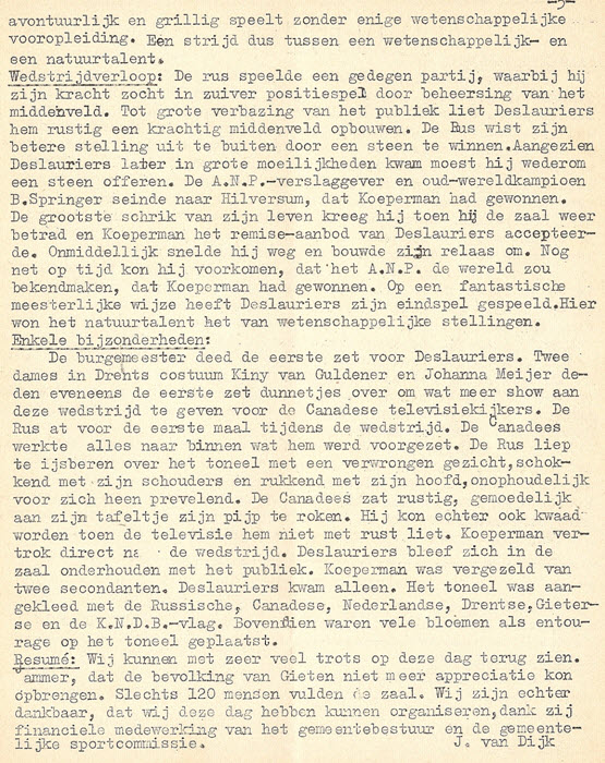 Maar dit even terzijde. Bé Speelman is goed gedocumenteerd voor wat betreft de damactiviteiten in ons dorp. Hij beschikt over delen van de Sportspiegel aangaande damfestiviteiten. Hij stuurde ons het volgende bericht toe over de activiteiten in het kader van het tienjarig bestaan van de Gieter damclub in 1958. En daarin kunt u lezen dat op 13 oktober een partij in het kader van het WK-dammen in Gieten zal worden gehouden!