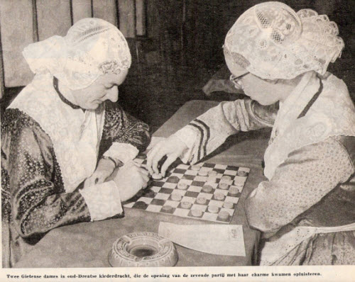 In de film die indertijd over het Gieter dorpsleven is gemaakt is ook een episode opgenomen over een dam- en schaakbijeenkomst.