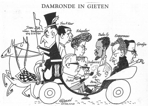Hier gingen de deelnemers samen met het ontvangstcomité op de foto. Uit de berichtgeving uit die tijd werd ik gewaar dat Baba Sy, een zwarte dammer uit Senegal een waar fenomeen was. Wie herinnert zich hem? Waren de in Drentse klederdracht geklede vrouwen/meisjes uit het dorp? Wie zijn het? Misschien was u er wel bij - Laat het ons weten!