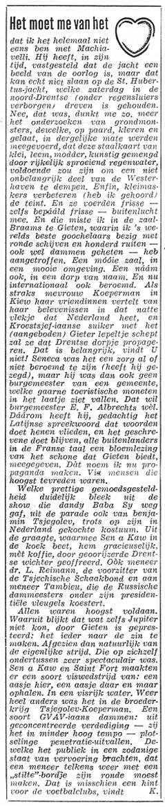 Het verslag dat naderhand in de Sportspiegel heeft gestaan geeft een mooi tijdsbeeld: de deelnemers kwamen met de trein en werden afgehaald van station Emmen. Daarna werden ze vergast op een Drentse koffietafel. De RONO verzorgde op de wedstrijdavond een uitzending via 'de band' en de NCRV verzorgde vanaf vijf voor tien een rechtstreekse reportage vanuit zaal Tent. Het gaat hier nog altijd om radio, hč! De deelnmers werden gecategoriseerd naar het criterium of ze al of niet een wetenschappelijke damopleiding hadden gehad. Een wetenschappelijke damopleiding???? Wel jammer was dat de belangstelling uit het dorp geen gelijke tred hield met het enthousiasme van de voorzitter en de pers. Enigszins teleurgesteld meldt voorzitter Van Dijk dat er slechts 120 in de zaal zaten...