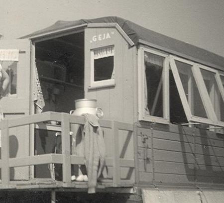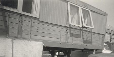 Maar Edzo Kolk had het ook mooi voor elkaar. Tegenwoordig zien we in de zomertijd de meest luxueuze campers op de wegen rondrijden. Allemaal van die gelikte polyester dingen. Nee, dan Edzo. Hij was een pionier! In de zomer zette hij gewoon een opbouw op de schotten van de oplegger. Een paar ramen erin en een deur en zie hier: één van de mooiste kampeerwagens die ik ooit heb gezien.