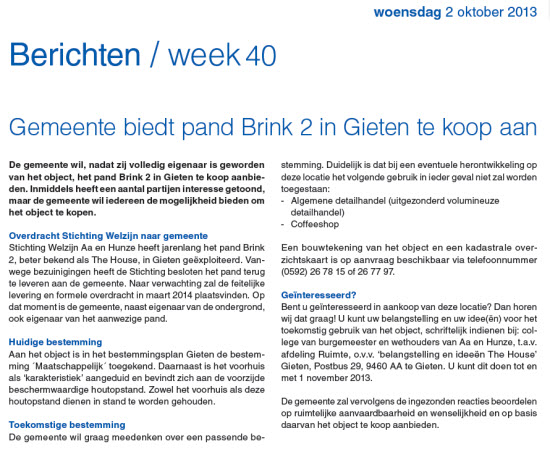 (2013-10) Hoe het begon, en hoe het eindigt: 'Times are changin' Ruim 45 jaar nadat in de pastorie een koffiebar werd begonnen wil de gemeente The House weer verkopen. Waarbij expliciet wordt vermeld dat het exploiteren van een coffee-shop geen optie is. Misschien kunnen we er een rusthuis voor oud-House-bezoekers van maken? En dan noemen we het "Sunset Boulevard"??