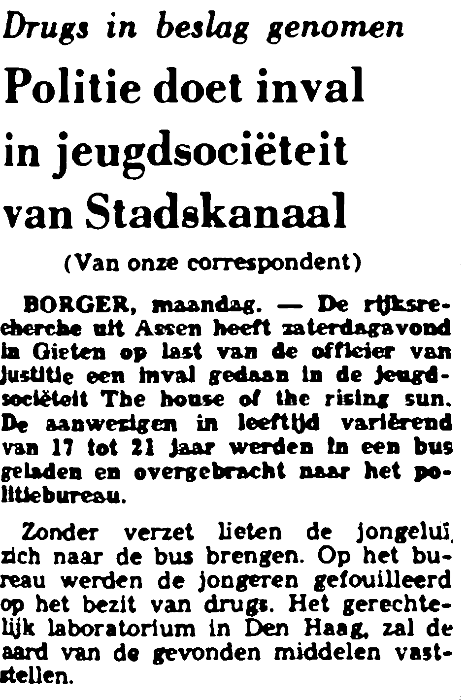tekst van het Bob Dylan-lied " Deze foto stamt uit de begintijd en is afkomstig uit het album van Willy Roelfsema uit Winschoten. Tegenwoordig wordt er in het fietsenhok van bijna elke doorsnee dorpsschool heel openlijk een stickie gerookt. Eind jaren zestig was het gebruik van hasj nog een exotisch gebeuren. Iets uit de grote stad, dat gebeurde niet in een Drents dorp. Groot was dan ook de commotie in het begin van 1970 toen men in de de gaten kreeg dat 'oeze jongs en wichter' in The House ook wel eens aan de waterpijp lurkten of gewoon een joint rond lieten gaan. Op 21 april 1970 sloot het stichtingsbestuur 'The House', maar wilde een passende oplossing zoeken. Het kwam met een zeer progressief beleid: gecontroleerde tolerantie. Dit moderne beleidsjargon kwam er ruwweg op neer dat het bestuur zei: "We openen de soos weer gedurende een proefperiode van zes weken. We weten wel dat jullie daar roken, maar in godsnaam laat het niet uit de hand lopen. Bedenk daar iets voor, dan zullen wij dat matig gebruik door de vingers zien" Op de één of andere wijze zijn er lieden geweest die geklikt hebben. Zij hebben de Officier van Justitie ingefluisterd dat men het in Gieten toestond dat er in een openbaar gebouw stuff gerookt werd. Op 23 mei 1970 ging hij over tot handelend optreden. Een grote politiemacht deed een inval in The House. The House was gebrandmerkt als de opiumkit van het Noorden. Het Parool, met randstedelijke flair Gieten en Stadskanaal op één hoop gooiend, berichtte er 's maandags het volgende over: