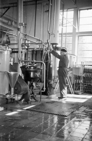 Ziet u hoe mooi deze ruimte is betegeld? Zowel de vloer als de wand. Dan ging het over de flessenafdeling naar boven. Daar stond de grote 'automatische boterton'. Ik herinner me dat daar vooral Ep Venema werkzaam was. De hele ruimte was geel betegeld en de boterton was blank gelakt in een rood frame. Een schitterend gezicht.