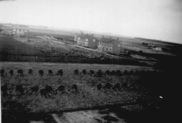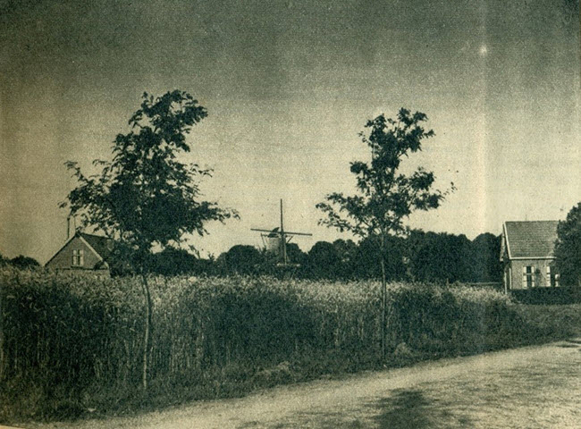 (2018-09) Hierboven hebben we een aantal foto's of details van foto's laten zien van de Molenstraat en de daarachter gelegen es. We willen daar een paar mooie foto's aan toevoegen. De eerste kregen we van Klamer Bos. De bouw van de Molenstraat is nog maar net in gang gezet. We kunnen welhaast nog onbelemmerd over de Noordes heen naar Eext kijken.