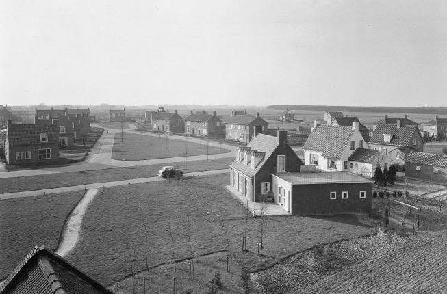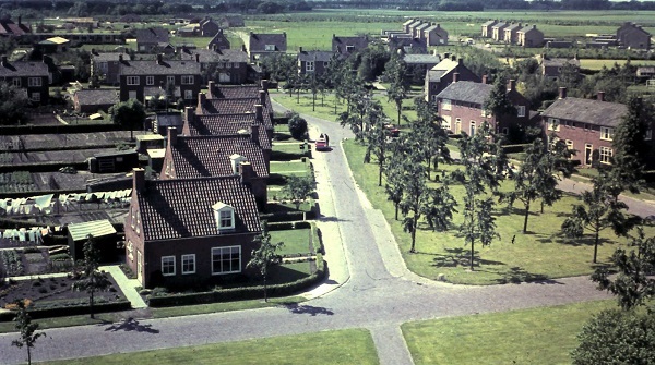 (2022-05) Het was in 1966 dat Tamminga vanaf de molen onderstaande foto van de Noordes maakte. Op een maandag, denk ik. Want het is blijkbaar wasdag, het wasgoed wappert lekker luchtig aan de waslijnen achter de voorste huizen van de Molenstraat. De moestuinen zien er ook tip-top uit. Achter de huizen van de Julianalaan zijn de eerste woningen aan de Stokleggingslaan al gebouwd. Nog prominenter in het zicht staan de nieuw gebouwde huizen van, wat is het, Korte Bree of Keurnotenlaan? Volgens Fenna Pauw moet het, gezien de positie ten opzichte van haar ouderlijke woning aan de Landspoelen, de Korte Bree zijn.