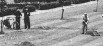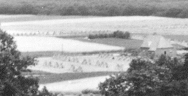 We zien hier in de detailfoto ook korenschoven staan. Het zijn bundels korenhalmen, die tegenelkaar gezet werden. Ik twijfel er niet aan dat we te zijner tijd nog wel duidelijke foto's van zulke schoven krijgen, alsook van de 'zaadbulten' die later van deze schoven werden gemaakt, toen het dorsen niet meer met de vlegel op de deel geschiedde, maar toen de dorsmachine één keer per jaar voorbij kwam. |