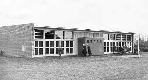 ![]() Bovenstaande foto is gemaakt op de dag dat de kleuterschool geopend is. Dat was op 4 december 1954. Menigeen kwam even een kijkje nemen. De school had 17.000 gulden gekost. Links was de zogenaamde 'stoeltjesklas': hier werd geknipt, geschilderd en geplakt. Rechts |