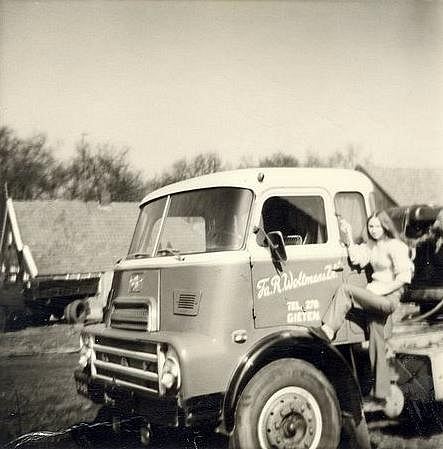Roelof Woltman heeft ook een DAF gehad. Ook deze is in de kenmerkende geel-rode bedrijfskleur gespoten. Maar ja, de kleuren zijn op een zwart-wit foto niet zo goed te zien. De dochter van Jan Pruim uit Weerdinge fleurt de auto extra op. Ze vond het kennelijk wel stoer om als een heuse fotomodel op de truck te poseren.