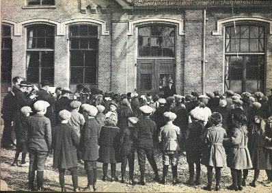 De boomplantdag was een jaarlijks terugkerend festijn. In het staatsbos werd er in april door de hoogste klassen even een mooi stukje natuur aangelegd. | Op deze foto wordt voor de oude school onder leiding van meester Begeman het boomplantlied gerepeteerd. Natuurlijk begeleid door de blazers van de Harmonie. Deze foto werd ingezonden door Henk Bos uit Lengel. Dit is een andere foto van dezelfde gebeurtenis. |