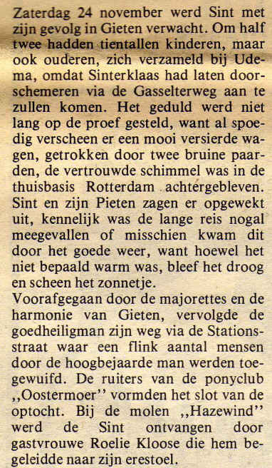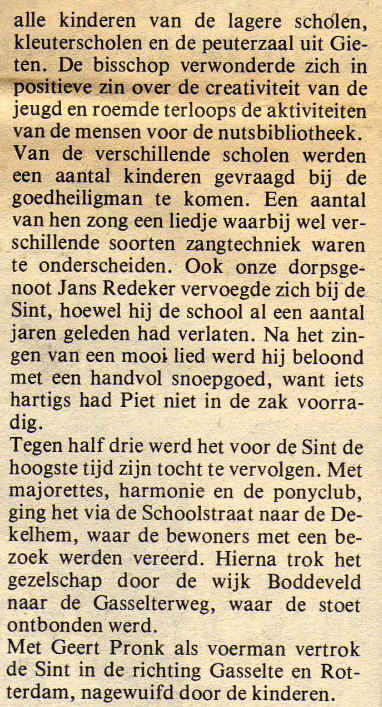 In de jaren zeventig scheurde Sinterklaas, achterop de tandem bij de Zwarte Pieten door Gieten. Ik ben benieuwd of u herkent wie er achter deze vermommingen schuil gaan... (2008-11) Harrie en Roelie Kloose waren thuis de kast aan het opruimen. Daar kwamen ze een oud bericht uit de Schakel tegen. Het is uit 1979. Wel grappig om te lezen. het geeft een leuk tijdsbeeld. Wat is er allemaal niet meer? Udema, Wethouder Hogenesch, ruïnes op de Brink, de nutsbibliotheek. Maar helemaal hilarisch is de passage over het kindje Jans Redeker, dat kennelijk in zijn gebruikelijke kennelijke staat het feest ook opluisterde...