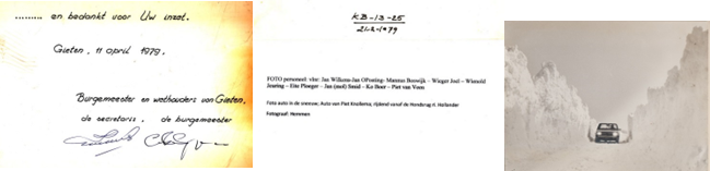 Op de foto bij de bedankbrief staat de Simca van Knollema tussen metershoge sneeuwduinen