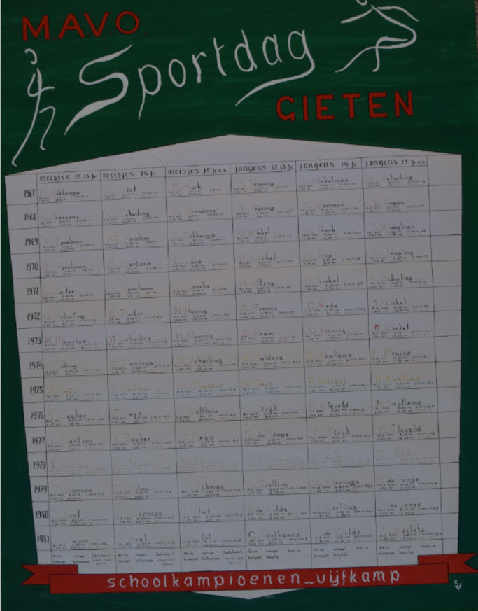 We deden een aantal leuke ontdekkingen. De crew van Het Collectieve Geheugen blijkt voor de helft uit sporthelden te bestaan. Harrie Kloose was in 1959 de kampioen in in de leeftijdsklasse16 jaar en ouder en Henk Alting wliet zich in 1971 op het schild hijsen in de klasse 12-13 jarigen.
