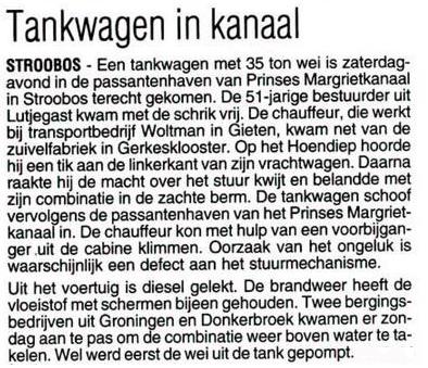 Bij Gerkesklooster raakte Klaas met truck en oplegger in het Prinses Margrietkanaal. Naar later bleek was de oorzaak een gebroken stuurstang. Klaas is uit het voertuig gekropen en zat op het dak van zijn Scania te wachten op hulp. Een operator die om tien uur vrij was en voorbij kwam zag toevallig de tankwagen in het kanaal liggen doordat de lichten nog branden. Dat was het verhaal van Joris. In de Leeuwarder Courant van de maandag daarna stond het volgende te lezen: